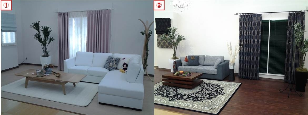 「エレガンス」と「クラシック」テイストのコーナーでは、ライフシーンを提案した大きな疑似部屋スペースをご用意【写真(1)/写真(2)】。「モダン」「ナチュラル」テイストのコーナーでは、若い世帯をターゲットに、持ち帰りの出来る既製カーテンでのポイントプレゼンテーションスペースを展開しています【写真(3)/写真(4)】。