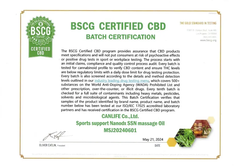 アスリートが安心して使用できるよう「Sports Support nanodx」ブランドから発売する製品は「BSCG Certified CBD」認証取得を義務付けています。本日発売するSSNマッサージオイルは「BSCG Certified CBD」認証取得済。