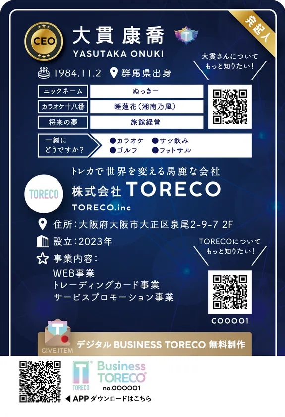 株式会社TORECO(所在地:大阪府大阪市、代表取締役:大貫 康喬)が、人と人との繋がりを創出し中小企業や小規模事業者のビジネスを活性化することを目的としたトレーディングカード型次世代名刺「Business TORECO(R)(ビジネストレコ)」の販売を開始しました。