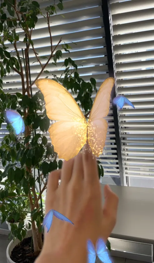 カメラ内で手を開くと、たくさんの蝶が羽ばたいて指先に蝶がついてきます。