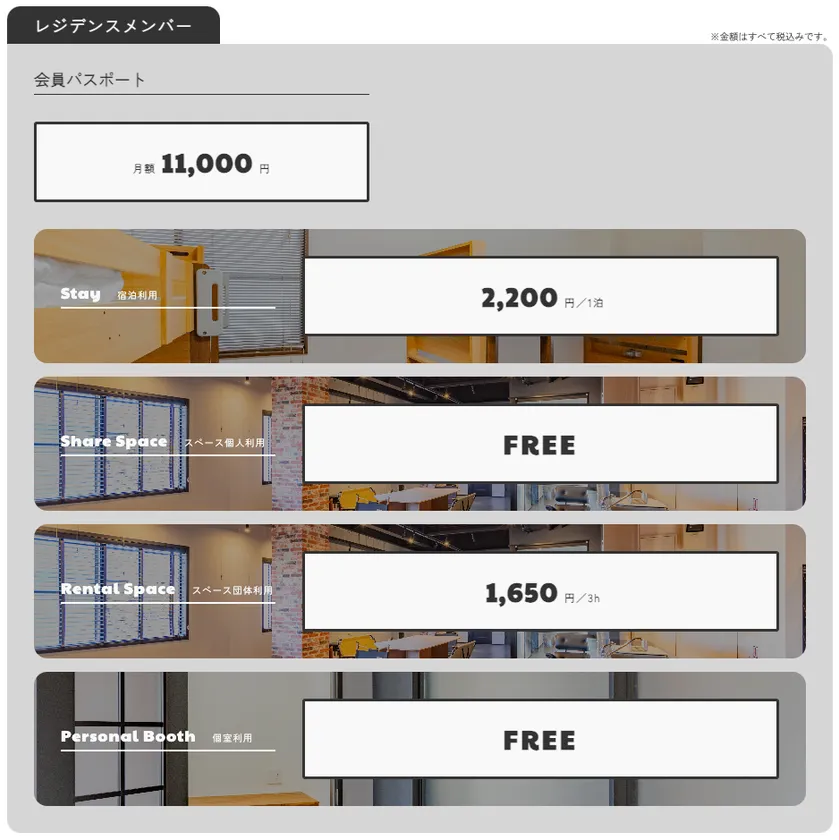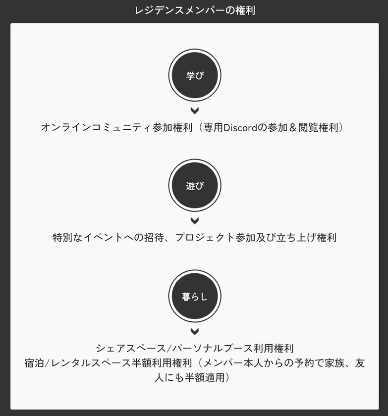 レジデンスメンバーは会員パスポート(月額11,000円)を購入し、「学び・遊び・暮らし」に紐づいた権利を得ます。