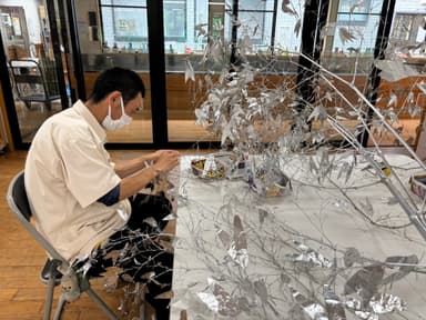 笹の葉を全て取り、そこへ銀の葉っぱを作り、一つひとつ丁寧に取り付けていただきました。