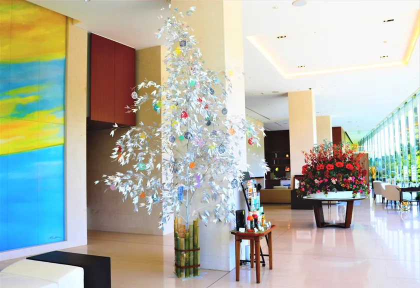 真心のこもった、世界にたった一つの素晴らしい七夕飾りがホテルのロビーで輝いています。