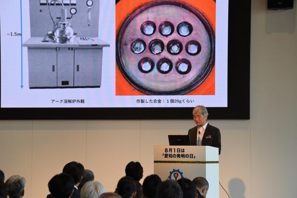 大同特殊鋼株式会社顧問で本学の佐川眞人特任教授が「愛知の発明の日」の8月1日、名古屋市昭和区鶴舞の「STATION Ai」で開催された記念講演会で登壇し、「ネオジム磁石の発明~イノベーションを起こすのは若い研究者~」と題して、世界最強の永久磁石「ネオジム磁石」の開発の経緯の紹介を通して、「ここにいる若い人たちが研究者になって社会に貢献してほしい。イノベーションを起こせるのは若い間だけ」と呼び掛け、若手研究者にエールを送りました。