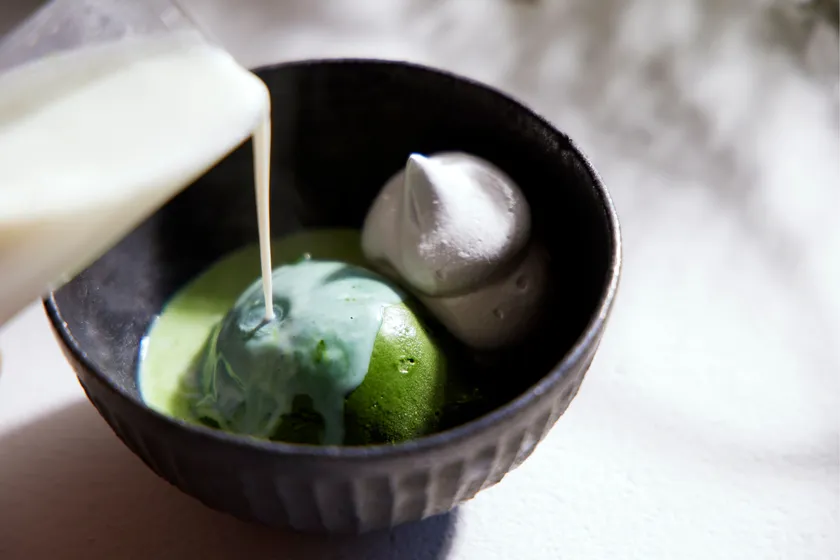 『awaはちみつ極濃宇治抹茶アイス』に冷たいミルクを加えるだけで簡単本格抹茶ラテが完成。