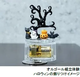 オルゴール職人のサポートのもと、好みの曲、ケース、コースを選んで、自分だけのオルゴール作りが体験できます。ハロウィンにお勧めの飾り付け小物(ハロウィン小物は1点330円~)もご用意しています。