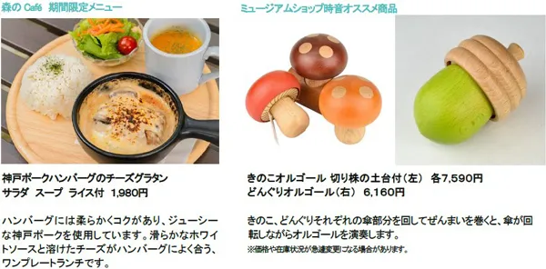 音楽や現代アートなど、芸術の秋を満喫できるイベントです。オルゴールなどの自動演奏楽器による「演奏家のいないオータムコンサート」の他、平日限定の特集タイム「森の音ミュージカルフェア」で、おなじみのミュージカルソングを演奏します。