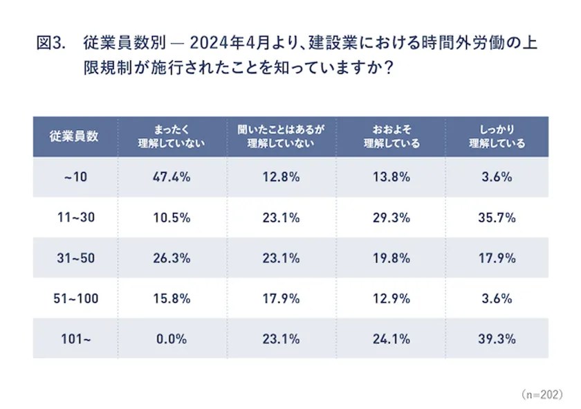 また、従業員数別の理解度を集計したところ、従業員数~10名規模の小規模事業者では、「全く理解していない」「聞いたことはあるが理解していない」を選択した回答者の合計が60.2%と、上限規制への理解度が低いことが分かる結果となりました。