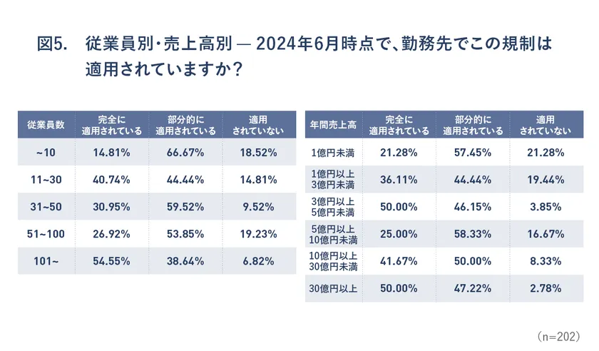 5:図5:従業員数別,売上高別 - 2024年6月時点で、勤務先でこの規制は適用されていますか?