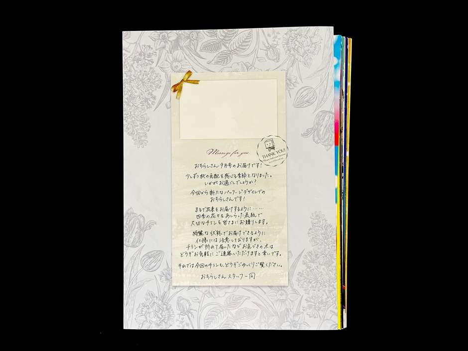 表紙にあしらわれた四季の花々の真ん中には、おちらしさん会員にファンも多い手書きのメッセージ。美術版の帯には「エアラス」紙を使用しており、柔らかな手ざわりも楽しめる仕様となっています。