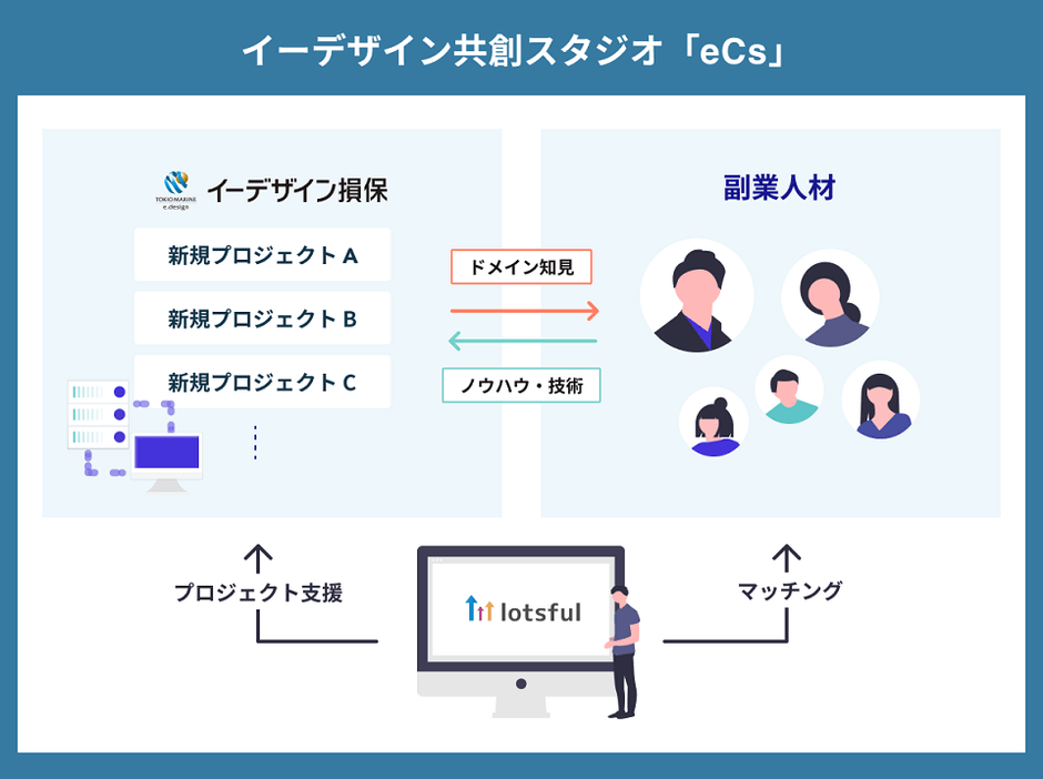 総合人材サービス、パーソルグループのパーソルイノベーション株式会社(本社:東京都港区、代表取締役社長:高橋 広敏)が運営する副業人材マッチングサービス「lotsful(ロッツフル)」は、イーデザイン損害保険株式会社(URL : https://www.edsp.co.jp/ 本社:東京都新宿区、取締役社長:桑原 茂雄、以下イーデザイン損保)の、『イーデザイン共創スタジオ(e-design Co-creation studio『eCs』)』の公式パートナーとしての支援開始ならびに、イーデザイン損保の新規事業に関わる副業人材を2021年3月30日(火)から公募します。「lotsful」の支援する副業人材とイーデザイン損保は、これまで新規事業プロジェクトの実証を重ねており、今回が初めての公募となります。