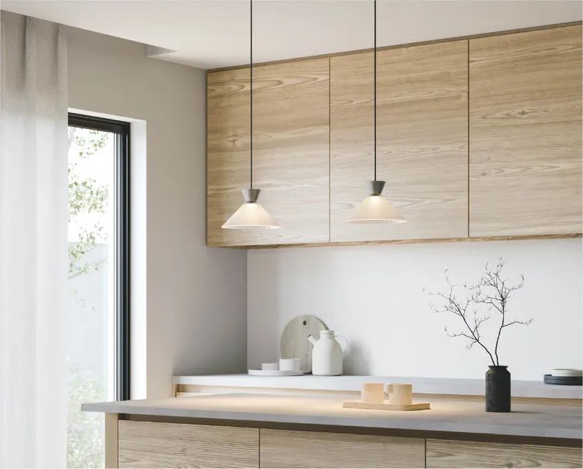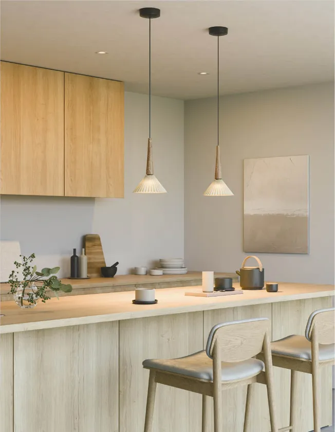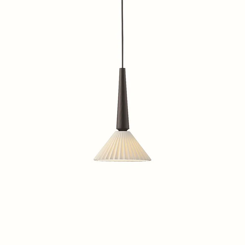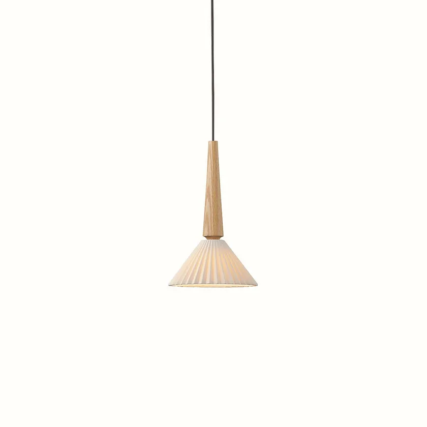 無垢材から削り出した木飾りとプリーツデザインの磁器セードを組み合わせたペンダントライトを8種ラインアップいたしました。磁器特有の優しい陰影と点灯感により、あたたかく落ち着いた雰囲気を演出します。また消灯時は、プリーツのくっきりとした陰影が見え、上品で繊細な印象を空間に与えることが出来ます。色温度は、2色(2700K電球色/3500K温白色)、飾り部分のカラーを2色(タモ、タモ・黒色塗装)ご用意し、お好みのインテリアや目的・用途に合わせてお選びいただけます。