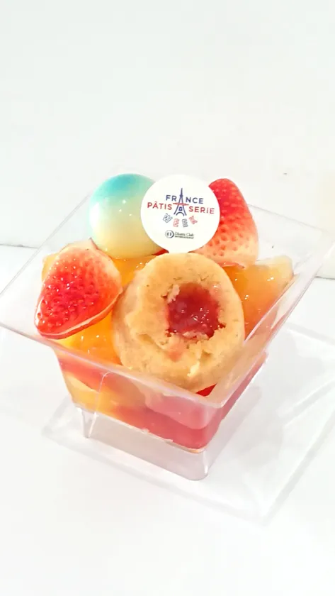 柔らかく焼き上げたスポンジに、ラム酒風味のシロップをたっぷり浸み込ませたサヴァラン。カップの底にはラム酒のジュレが入っています。スポンジの上には、シャンティと苺、オレンジ、ブルーベリーを飾りました。甘さとアルコールを抑えた、みずみずしく暑い日でも食べやすい味わい。ダロワイヨ自由が丘本店で限定販売。