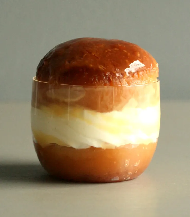 クリオロ流の口どけの良い食感のサヴァラン!香り豊かなホワイトラムのシロップをたっぷり生地に染み込ませ、カスタードクリーム、マンゴー&パッションフルーツのジュレを合わせました。パッションフルーツシードのプチプチとした食感がアクセント。夏らしいさっぱりとした味わいに仕上げました。