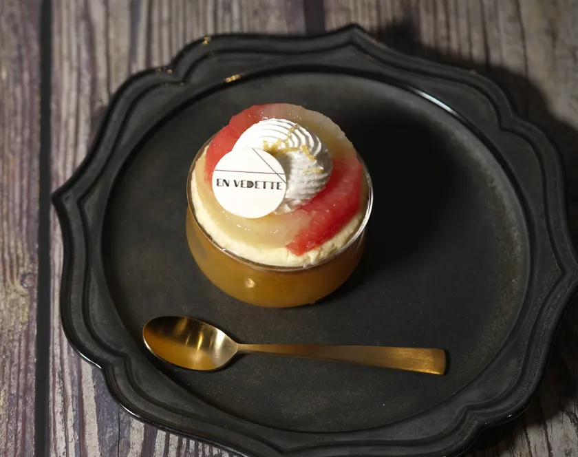 春先に完熟した香川県産レモンのレモン果汁をしょうがに加えた出汁に浸し、しっかりと焼き上げたブリオッシュ生地にレモンのクリームとシャンティ、カスタードクリーム、レモンのコンフィ、リモンチェロで組み立てました。夏らしく軽やかにみずみずしい食感にフルーツ酸が美味しい夏のお菓子です。