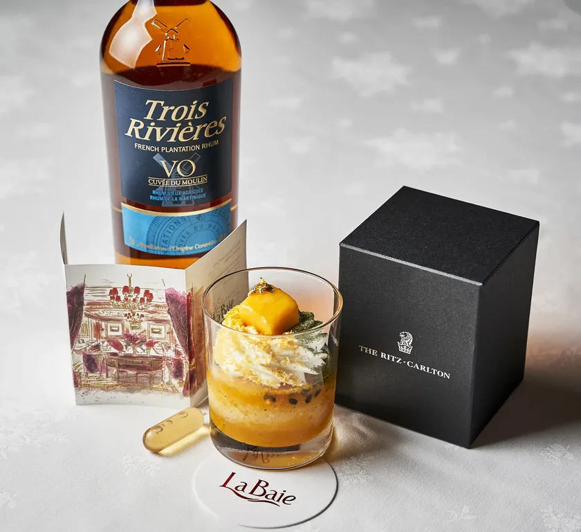 伝統的なフランスのデザートを有名フレンチレストラン「ラ・べ」のスタイルでご用意。サヴァランをマダガスカル産バニラ、ラム酒などを用いたシロップに漬け込み、自家製コンフィチュール(マンゴーと国産パッションフルーツ)、アマレットリキュールを加えたクリームを添えました。フルーティーな風味とリッチな味わいをお楽しみいただけます。「トロワ・リビエール」のマルティニーク・キュヴェのフレンチ・ラムはお好みでどうぞ。1日限定5個販売。期間中は「ラ・べ」でもこのサヴァランをお召し上がりいただけます。