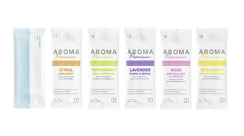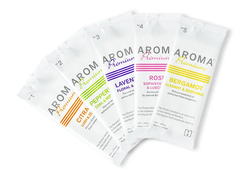 香りと心地よさが贅沢に広がる、記憶に残るアロマのおもてなしおしぼりです。香りは「シトラール」「ペパーミント」「ラベンダー」「ローズ」「ベルガモット」の5種類。
