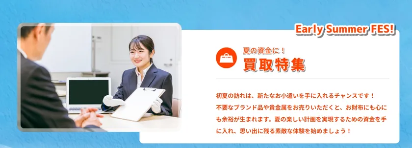 買取の相談や査定・お近くの店舗検索は「Early Summer Fes!」キャンペーン特設ページから行えます。