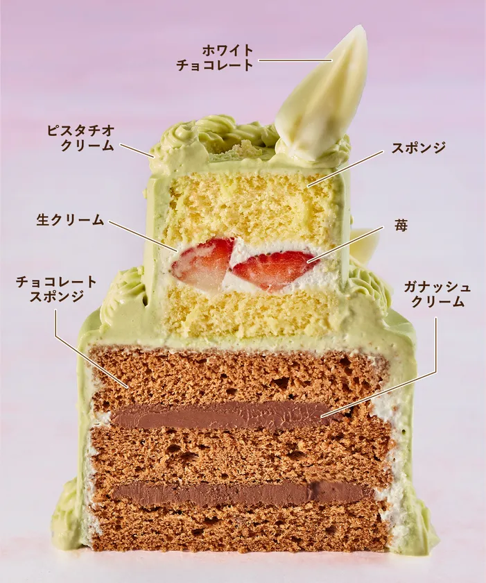 下段のチョコレートケーキ、上段のショートケーキ、トッピングはピスタチオクリームと、様々な味わいが楽しめる贅沢なケーキです。