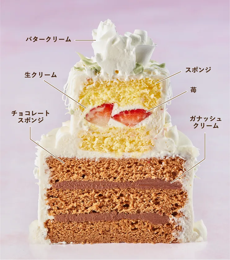 下段にはフランス産チョコレートを使用した濃厚でくちどけのよいガナッシュを使用したチョコレートケーキ、上段にはアニバーサリーで定番人気のショートケーキをのせ、2つの味のマリアージュが楽しめる贅沢なデコレーションケーキです。