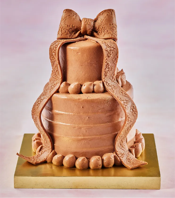 チョコレートのシックな色味で華やかさを表現したデコレーションケーキ。フランス産のスイートチョコレートとミルクチョコレートを使い、コク深い旨味と甘みのバランスのよいチョコレートケーキです。細やかな柄を引き立てる繊細なリボンの動きにもこだわりました。