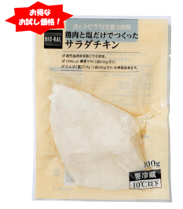 鹿児島県産桜島どりのむね肉と塩のみでつくった素材本来のおいしさを感じられるサラダチキン、しっとりとした食感に仕上げました。