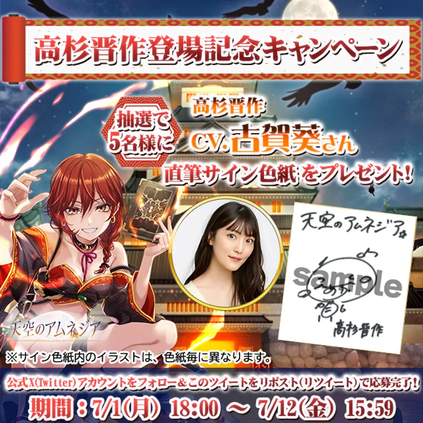 株式会社エムスタイル(所在地:東京都渋谷区、代表取締役:米島祐介)は、iOS/Android端末用スマホRPG「天空のアムネジア」の新英雄キャラクター「高杉晋作」リリースに伴い、声優を務める「古賀葵」さんの直筆サイン色紙が当たるプレゼントキャンペーンを2024年7月1日(月)18:00より開催いたします。
