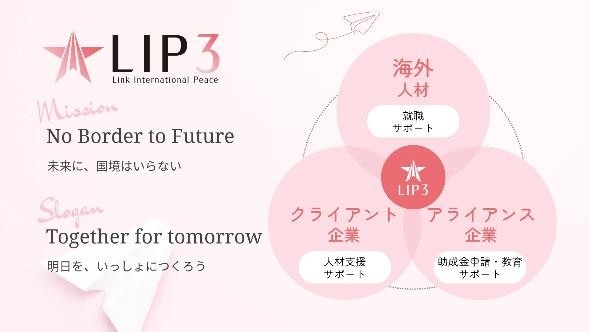 LIP3は、「Link(つなぐ)」「International(国際)」「Peace(安心)」という想いを名称に込め、日本と世界を、人と人を、心でつなぐ架け橋でありたいと考えています。