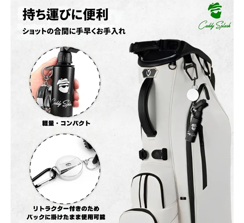Caddy Splash ゴルフウォーターブラシは容量:120mlのコンパクトなボトルにブラシがついた形状で軽量・コンパクトとなっています。また頑丈なリトラクター(長さ45cm)付きのため、ゴルフバッグに掛けたまま、素早く簡単に使用することができます。