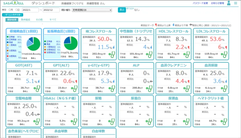 検査項目ごとに結果、判定を集計したパネルをダッシュボード形式に並べて表示し、組織全体の健康状況を可視化します。各項目について異常値がある人を抽出して人数と割合を表示します。また割合を前年の数値と比較し、項目ごとの集団の変化を数値で表現します。基準値を超えるなどの項目は個人単位まで掘り下げることができるため、組織の健康課題の把握と個人への的確なアプローチを行えます。
