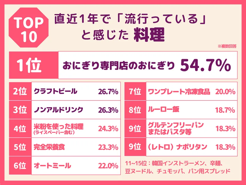 1位のおにぎり専門店は前回と変わらないままだが、昨年の酒税法改正を受けてビールの人気が戻ってきたことから、クラフトビールが2位に浮上、ノンアルドリンクも前回の6位から3位に上昇した。お酒を飲む人も飲まない人も楽しむスタイルは、この世代にも着実に受け入れられている模様。昨年から新商品が続々登場しているワンプレート冷凍食品が新たにランクインしているのも注目。10位以下ではあるが、韓国のインスタント麺やチュモッパなど、韓国系のトレンドも定着している。