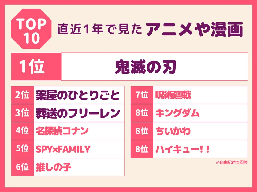 2位、3位は放送が終了したばかりの「薬屋のひとりごと」、「葬送のフリーレン」が続いた。いずれも放映は終了しているが、漫画や小説などをこの機会に読み始める人も多く、一定のファンがついている模様。世界規模の大会で注目されているバレーボールの影響か、「ハイキュー!!」も上がってきている。アニメ、漫画に関しては、もはや年代層ではくくれなくなってきている。