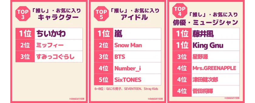 ここでも韓国で注目された「ミッフィー」などのキャラクターを推す傾向が見られる。アイドルに関しては、旧ジャニーズ事務所のタレントたちの人気が目立った結果となったのが特徴的である。