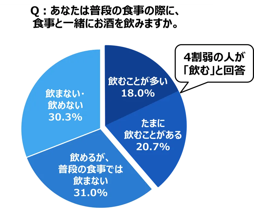 今回、新たに、世の中で注目されている食中酒に関して50代前後の女性たちにアンケート調査を行った。50代前後の女性たちに普段の食事(*1)の際に、食事と一緒にお酒を飲むか聞いたところ、4割弱が飲める状況であれば飲む、毎食ではないがたまに飲むと答えている。