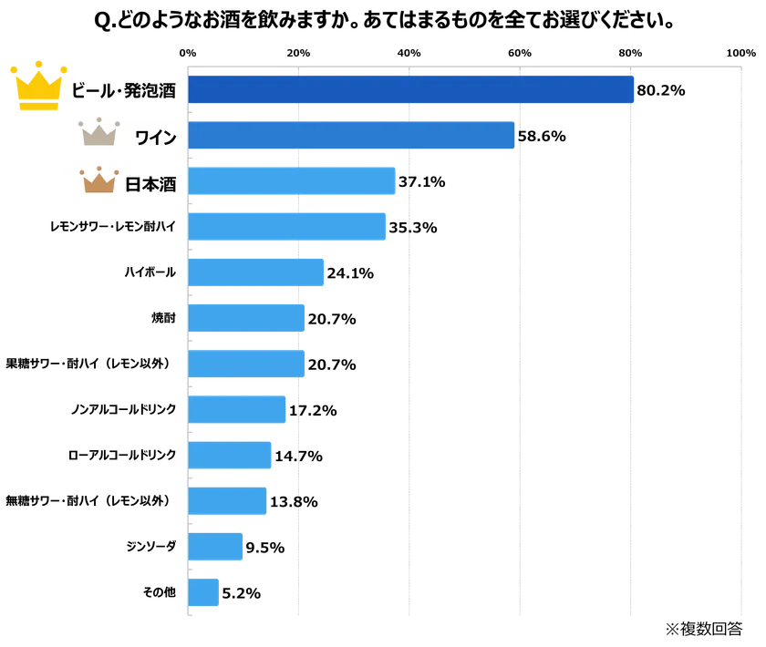 食事中に飲むお酒の種類については、1位ビール・発泡酒、2位ワイン、3位日本酒、4位サワー・酎ハイ、5位ハイボールと続いた。1位ビール・発泡酒は全体的な傾向と一致している。注目すべきは2位と3位のワインと日本酒で、同世代の男性層よりもワイン、日本酒を好む傾向が見られた。世代的にワイン、日本酒などになじみがある傾向や、炭酸系飲料が苦手など、この世代ならでは特徴があるのかもしれない。