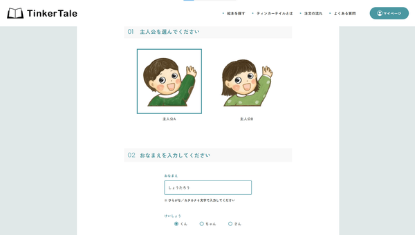 「TinkerTale(ティンカーテイル)」は、全国の書店で実際に販売される人気絵本のコンテンツを読者がカスタマイズできることが最大の特長です。「Tale= 物語」に「Tinker= 小さな変更を加える」という名前のとおり、絵本の主人公の名前をご自身やお子様、大切な人の名前に変更したり、キャラクターを指定したりすることができます。