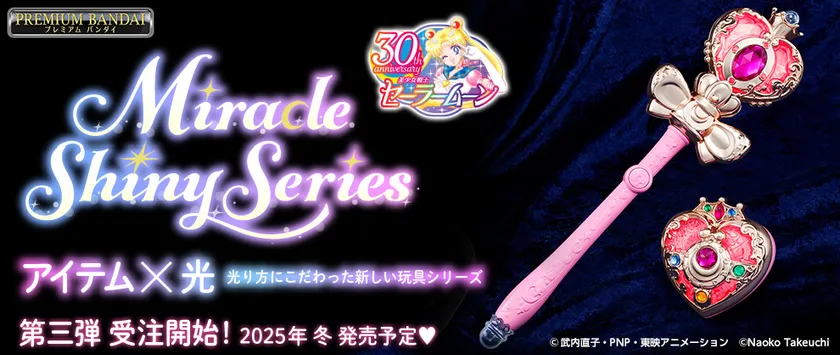1992年より放送されたテレビアニメ「美少女戦士セーラームーン」の放送30周年を記念し発売された、光り方にこだわった特別デザインのアイテムシリーズ『ミラクルシャイニーシリーズ』の第三弾が新登場!1994年より放送された「美少女戦士セーラームーンS」で主人公の月野うさぎが変身の際に使用する『コズミックハートコンパクト』と技を放つ際に使用する『スパイラルハートムーンロッド』を商品化いたします。