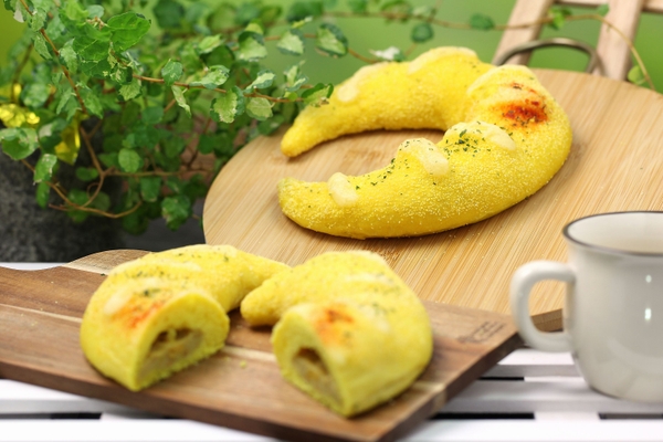 「黄金三日月カレーパン」は、山梨県甲府市の特産であるスイートコーン「きみひめ」を使用したレトルトカレー「黄金三日月カレー」を使用。