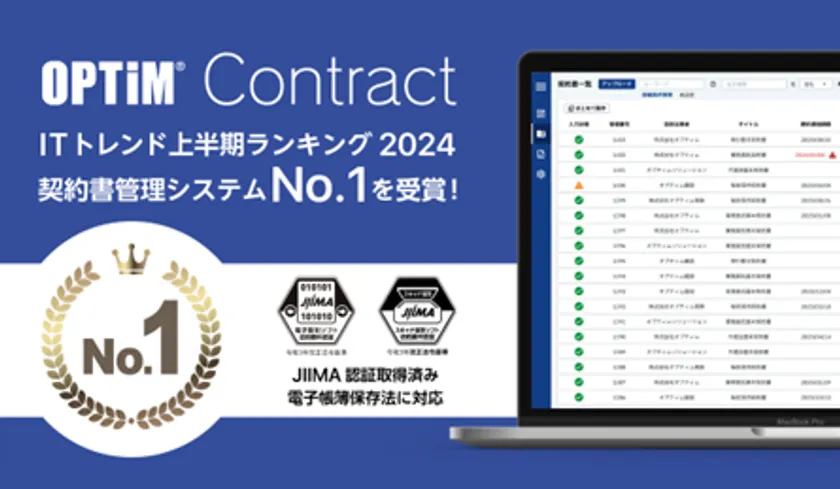 AI・IoT・ビッグデータプラットフォームのマーケットリーダーである株式会社オプティム(以下 オプティム)は、AIを活用した文書管理サービス「OPTiM Contract」において、累計4,000万人以上が利用する、法人向けIT製品の比較・検討サイト「ITトレンド」が公開した『ITトレンド上半期ランキング2024』の契約書管理システム部門で、No.1を獲得したことをお知らせいたします。