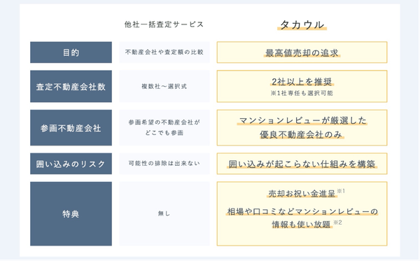「タカウル」は、下記のように他の不動産一括査定サービスとは異なった特長があります。