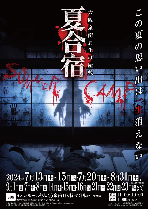 イベント企画 エス・プランニング(所在地:広島県広島市、代表:杉山 悟)は、夏季限定のお化け屋敷を大阪で3箇所同時開催することが決定いたしました。第1弾は2024年7月6日(土)~9月23日(月祝)の期間中、イオンモール堺鉄砲町2階特設会場にて「KEEP OUT」を開催。第2弾は2024年7月13日(土)~9月23日(月祝)にイオンモールりんくう泉南1階特設会場で「夏合宿」を開催。第3弾は2024年7月20日(土)~9月29日(日)の期間中心斎橋オーパ2階特設会場で「百忌夜行」を開催いたします。(※いずれも9月は平日休業)