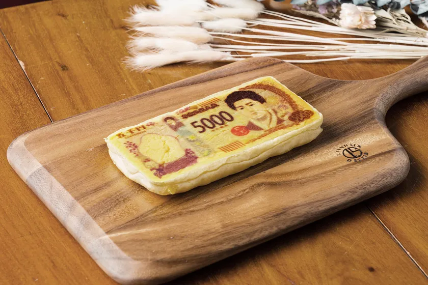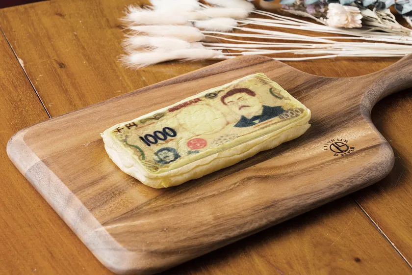 7月に20年ぶりにデザインが改刷される渋沢栄一翁肖像の新一万円札を模した日本初の一万円札パンです。「お札=おさつ=さつまいも」という連想から、中には自家製のスイートポテト餡とさつまいも甘露煮がたっぷり詰まっています。本物の一万円札と同じサイズ160mm×76mmに仕上げ、厚さは10mm強に。帯封もされ、まさに100万円札束を再現したパンです。