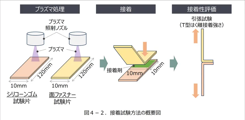 大気圧低温プラズマ技術は、薬液を使用せず、物質の表面を改質することで親水性や接着性を向上させることができます。シリコーンゴムと面ファスナーに大気圧低温プラズマを照射してプラズマ処理し、その表面に接着剤を塗布して接着することで、プラズマ未処理に比べ接着強さが約10倍以上向上しました。