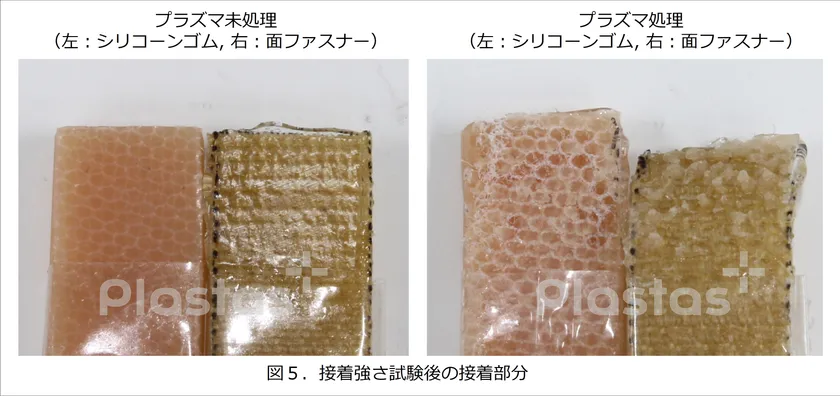 大気圧低温プラズマを照射していない試験片は、シリコーンゴム表面で界面はく離(※1)しています。一方、大気圧低温プラズマを照射した試験片は、シリコーンゴム表面が材料破壊(※2)しています。
