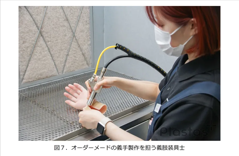 共同開発した義手製造技術は、シリコーンゴム製の義手の表面に大気圧低温プラズマを照射してプラズマ処理する新技術で、義手を身体に固定するための面ファスナーの接着強さを約10倍以上向上させました。義手の耐久性を向上するだけでなく、プライマーなどの薬液処理や研磨などの下地処理を削減することで、義手製作を担う義肢装具士の作業環境を改善しました。