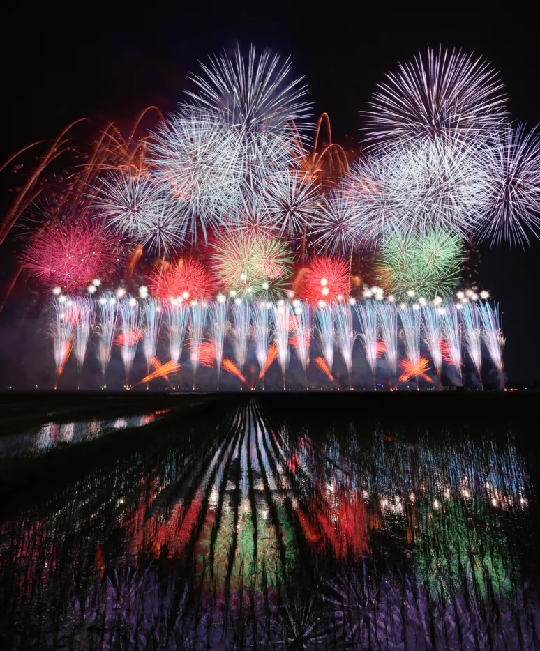 たまむら花火大会は「群馬の夏は玉村の花火から」といわれ、県内でも一番早い時期に開催される花火大会です。田園地帯で花火を打ち上げるため、至近距離で迫力ある花火であることはもちろん、田んぼに花火が反射することで映し出される逆さ富士ならぬ「逆さ花火」を見ることができ、風情溢れる花火大会となっています。