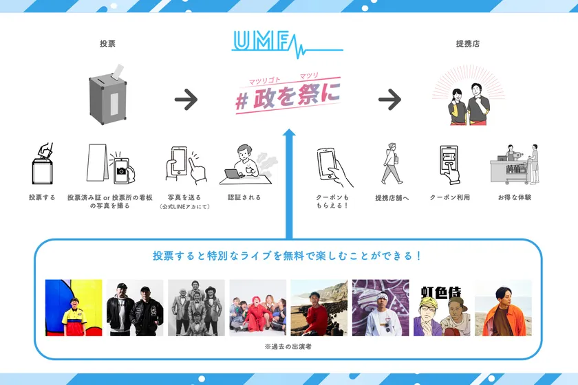 一般社団法人UMF(所在地:大阪府大阪市、代表:高村 治輝)は、7月7日東京都知事選挙にて都民が投票を行うと、様々なお店のモノやサービスが無料/割引になるクーポンを配布し、オンライン配信にて賛同アーティストのライブ映像を楽しめるイベントを実施します。