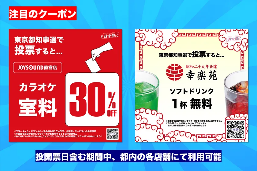 東京都知事選挙で投票すると都内のお店でオトクがいっぱい! 都民が投票を行うと、様々なモノやサービスが 無料/割引になる「#vote_forプロジェクト」を実施