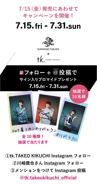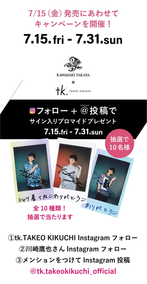 tk.TAKEO KIKUCHI (ティーケー タケオキクチ) シンガーソングライター川崎鷹也さんとの コラボレーション商品を7月15日(金)より発売!