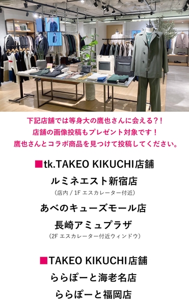 ワールドグループの株式会社エクスプローラーズトーキョーが展開するメンズブランド「tk.TAKEO KIKUCHI (ティーケー タケオキクチ)」は、シンガーソングライター川崎鷹也(カワサキ タカヤ)さんとのコラボレーション商品を7月15日(金)より発売いたします。